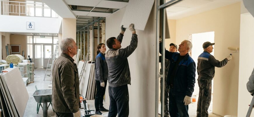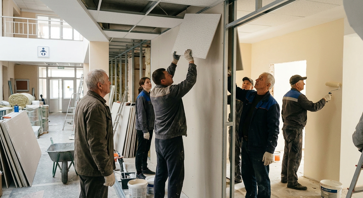 Сотрудники исполкома занимаются демонтажными работами. Они снимают элементы вентиляционной системы, удаляют плитку с пола и стен, а также выносят старую мебель. Эти действия составляют часть подготовительного этапа капитального ремонта здания. Мозырский роддом выполняет функции центрального учреждения для пяти районов Полесского региона, что определяет его значимость для системы здравоохранения области.