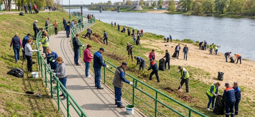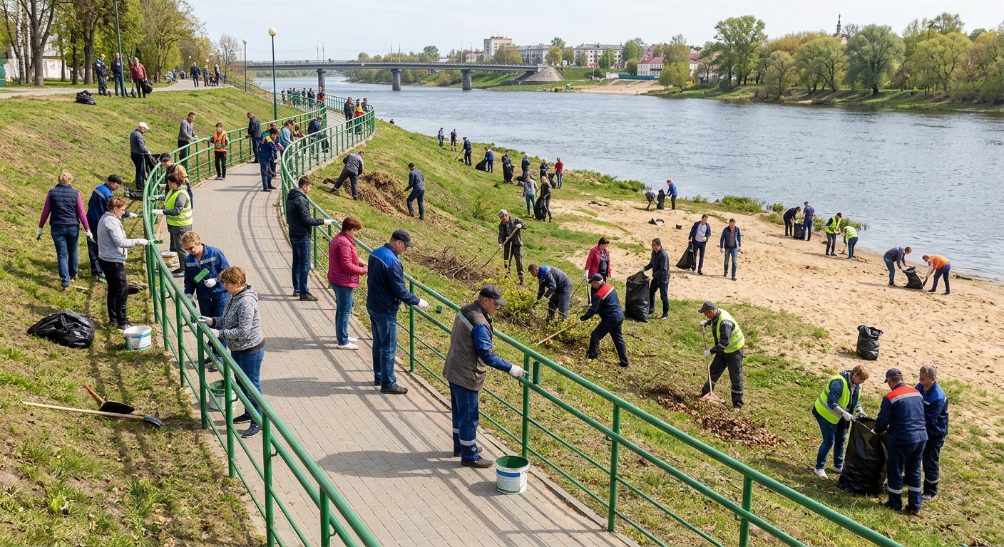 В городе Речица на берегу Днепра проходит масштабный субботник, в ходе которого преображается Речицкая набережная и прилегающая к ней территория городского пляжа. Мероприятие организовано в рамках республиканского дня благоустройства и объединило представителей органов власти, депутатов, работников коммунальных служб и сотрудников различных организаций.