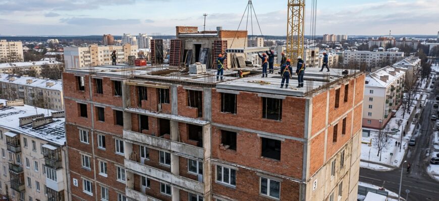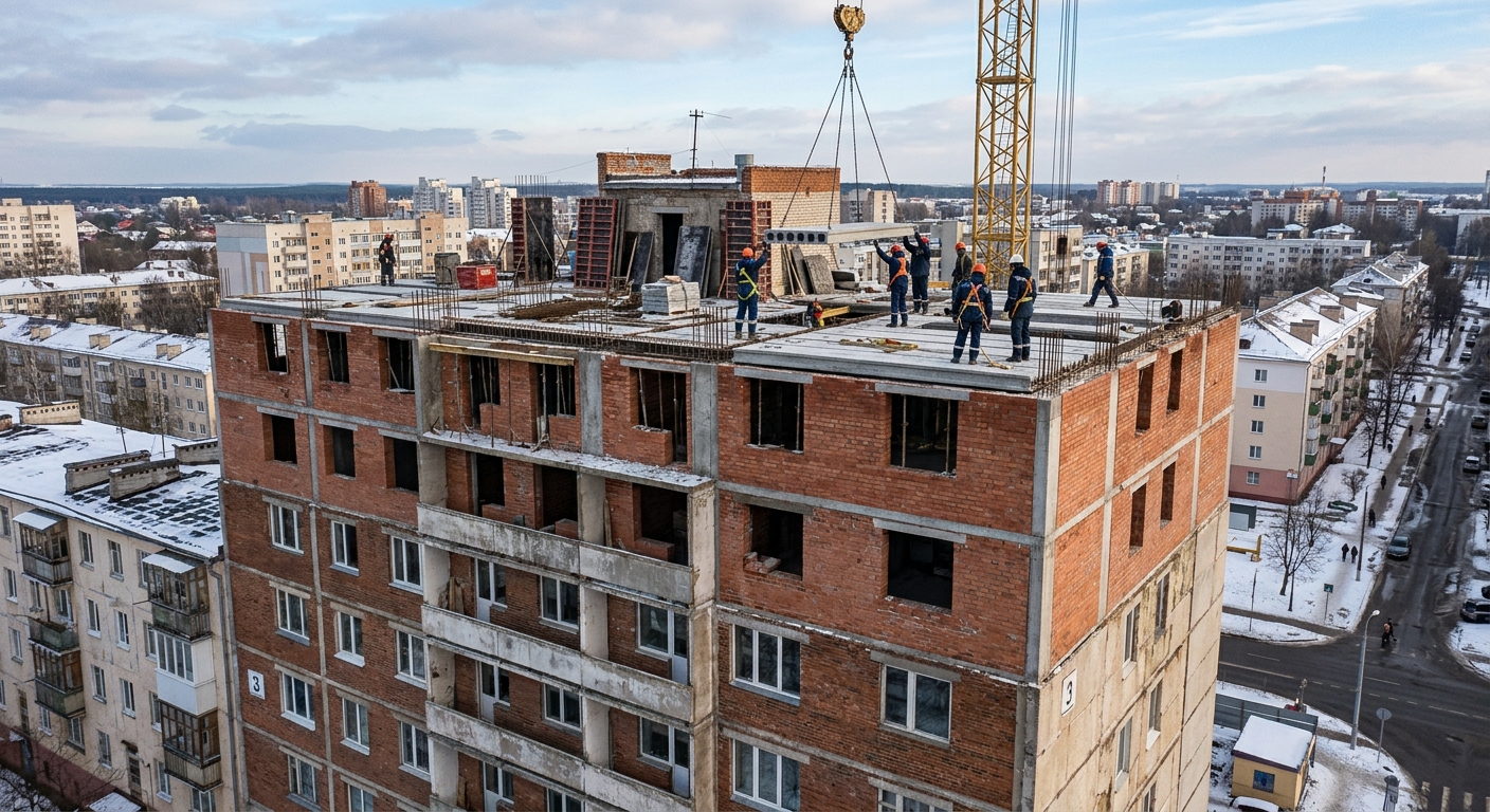В десятиэтажном доме №3 по улице Косарева в Гомеле, где в середине декабря 2025 года произошла вспышка газовоздушной смеси, завершен монтаж рядовых этажей с пятого по десятый. На объекте начались работы по устройству технического этажа и плит кровли. Восстановительные работы планируется завершить до конца месяца, сообщил руководитель, ответственный за объект.