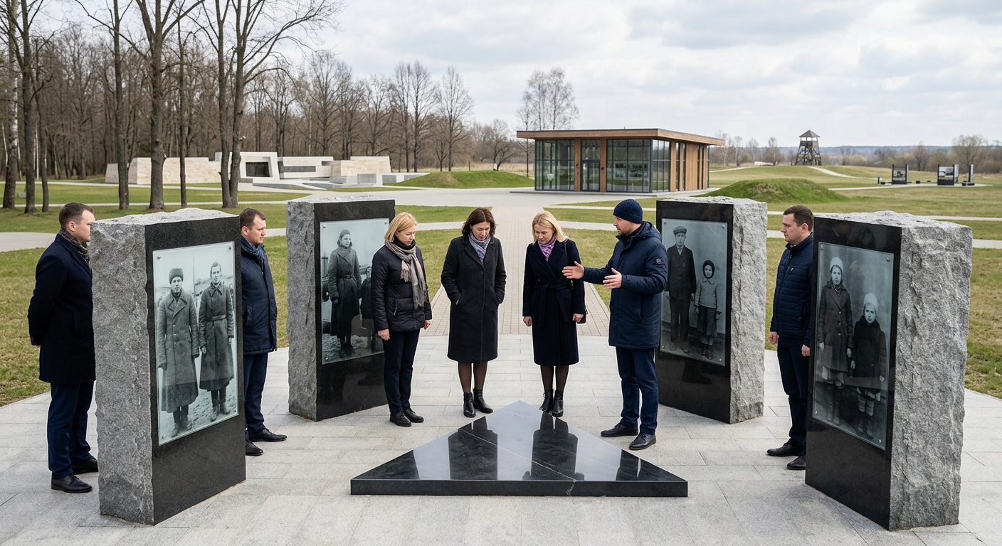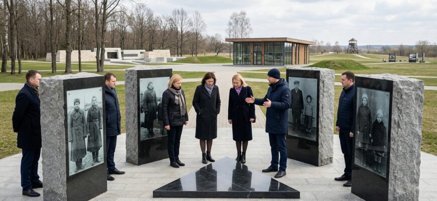 Первым объектом посещения стал мемориальный комплекс узникам Озаричского лагеря смерти. Мемориал открыли в 2004 году. В 2023 году на объекте провели масштабную реконструкцию. Территорию расширили, возвели информационный павильон. Появились знаковые локации, отражающие события марта 1944 года. В центре установили «Камни прозрения» — четыре стелы с архивными фотографиями узников, сделанными во время освобождения лагеря. Между ними расположена треугольная плита из черного мрамора. На нее нанесли слова уроженки этих мест поэтессы Софьи Шах.